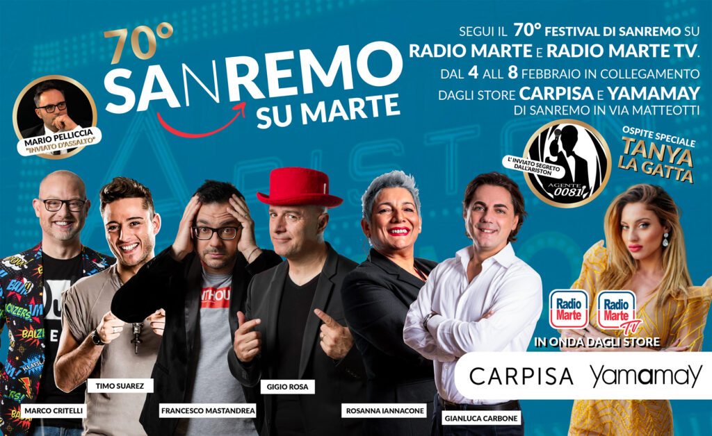 Da Gigi D’Alessio a Irene Grandi e Anna Falchi, i big in gara ed i giovani, con particolare predilezione per i campani Anastasio e Marco Senteri, i marziani ospitano ed intervistano in diretta per circa dodici ore al giorno. Un successo che replica quello dello scorso anno, ma con un “raddoppio” dato dal successo della vetrina live. Ed è proprio dalla Campania che arriva la stragrande maggioranza di proposte in cerca di visibilità e notorietà, a testimonianza della proverbiale prolificità artistica di Napoli e di tutto il sud, prezioso patrimonio per l’intero comparto della musica italiana. Il 70° Sanremo su Marte, può essere seguito in FM e DAB+, su app, web e social, oltre che su Radio marte Tv, canale 655 del digitale terrestre: collegamenti, musica ed interviste. realizzate nelle due postazioni d’impatto realizzate in collaborazione con Carpisa e Yamamay.