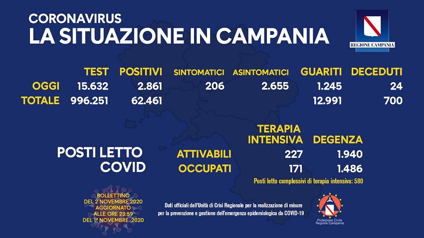 Sono stati 3.657 i positivi al Sars Cov-2 censiti ieri dall’Unità di Crisi Regionale rispetto a 23.479 tamponi eseguiti. Il rapporto contagi/test è sceso al 15,5% rispetto al 16,2 e al 18,6 dei due giorni precedenti. Nelle ultime due settimane il numero dei deceduti è stato di 75. Intanto, al bando della Protezione Civile della Campania per il reclutamento di 450 medici hanno risposto in 165. Sul fronte bombole d’ossigeno, per offrire un contributo alla collettività la Guardia Costiera della Campania ha raccolto bombole d’ossigeno terapeutico, dei centri diving del territorio i quali, al momento, non sono in attività, affidandole alla Croce Rossa Italiana per la distribuzione sul territorio. Una lodevole iniziativa per fronteggiare la carenza di bombole nelle farmacie di Napoli e non solo. E ieri, nell’ambito dello screening per la riapertura della scuola materna e della prima classe della primaria, fissato al 24 novembre, sono stati soltanto 80 i tamponi eseguiti all’Ospedale del Mare al personale scolastico, agli alunni ed ai familiari. Nessuno dei testati è risultato positivo. Il numero basso dei tamponi è dovuto prima di tutto alle difficoltà nel prenotare il test attraverso il numero verde. Per ovviare al problema si accetteranno, dunque, anche persone che non prenoteranno
