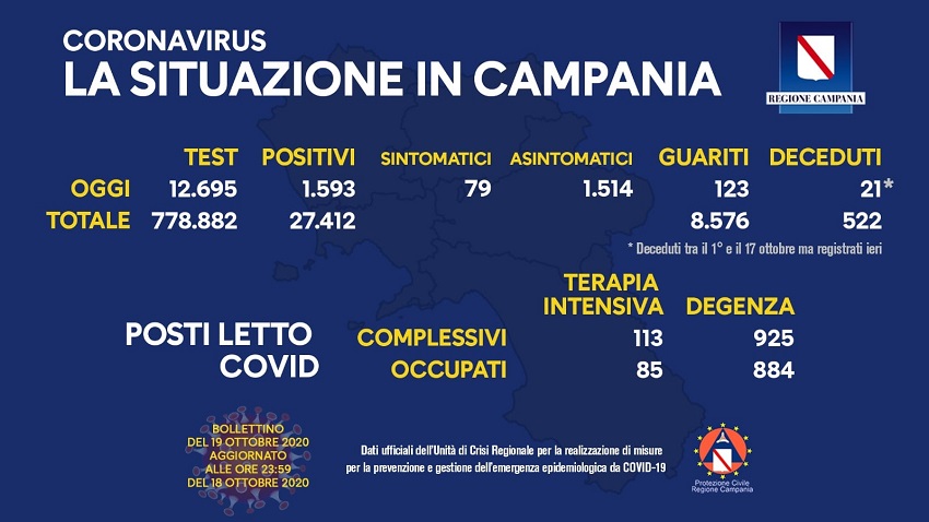 Nuovo aumento dei contagi in Campania di positivi al Sars Cov-2. Secondo il bollettino fornito ieri dall’Unità di Crisi Regionale, i positivi sono stati 1.593 su 12.695 tamponi eseguiti. Di questi 79 sono sintomatici; i guariti sono stati 123. Le persone decedute dal 1 al 17 ottobre sono 21. Sempre ieri una nota diffusa dall’Azienda Ospedaliera dei Colli ha reso noto che il direttore, Maurizio Di Mauro, è risultato positivo ma asintomatico dopo essersi sottoposto a un tampone di sorveglianza. Nella tarda serata il presidente della Regione, De Luca, ha firmato una nuova ordinanza. Confermato il divieto di vendita da asporto dalle 21, mentre bar, pasticcerie e gelaterie dovranno chiudere dalle 23 alle 5 del giorno successivo. Vietate  feste e ricevimenti, anche conseguenti a cerimonie, civili o religiose (matrimoni, battesimi), in tutti i luoghi al chiuso e all’aperto con la partecipazione di invitati che siano estranei al nucleo familiare convivente. Le restrizione sono confermate fino al 13 novembre. A Salerno e i provincia, intanto, sono stati registrati 104 casi, 20 dei quali a Scafati, mentre a Calvizzano, in provincia di Napoli, 27 anziani, ospiti di una Rsa, sono risultati contagiati.